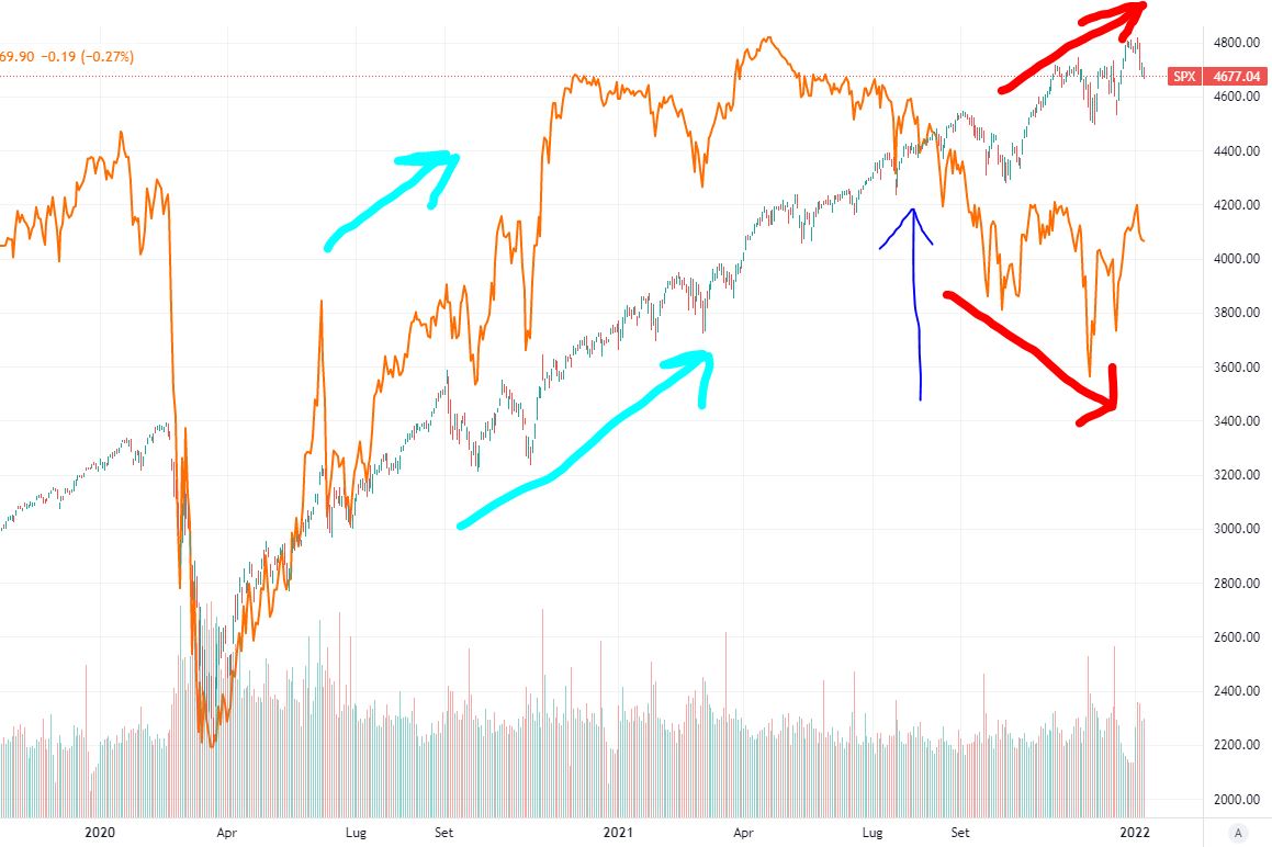 In che condizionai siamo? Analizzando l'S&P500 notiamo che da settembre ad oggi il mercato è continuato a salire ma considerando la somma delle azioni sopra la media a 200 periodi (colore arancione) notiamo che il numero di titoli che stanno partecipando a questo rally è nettamente diminuito dal mese di luglio/agosto 2021. Il rally è sano quando il mercato sale ed il numero di azioni sopra la 200 cresce mano a mano (frecce di colore azzurro). Viceversa il rally è meno sano quando il mercato continua a salire ma il numero di azioni sopra la 200 decresce (frecce rosse). Chiaramente NON sto dicendo che il mercato debba crollare: semplicemente è possibile che si debba assestare un pò andando in laterale (ipotesi migliore) oppure con sedute un pò negative (ipotesi peggiore).