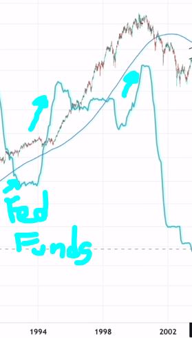 Il mercato nel complesso rimane toro anche se analizzando la curva dei rendimenti (che NON è un timing tool ) nella parte a lungo termine abbiamo un leggero appiattimento che andrà mano a mano monitorato. Non confondiamo poi il fatto che i tassi sui Fed Funds possano essere alzati col fatto che ci possa essere una recessione. Come ho già avuto modo di mostrare infatti, l'inizio di politiche restrittive può certamente provocare giornate ribassiste e di panico immediato che inevitabilmente comportano un incremento di volatilità MA storicamente, andando a ritroso negli anni, il mercato ha continuato a salire anche con politiche meno accomodanti che tuttavia dopo qualche anno hanno portato a delle recessioni. Guardate ad esempio cosa è successo all'inizio e alla fine degli anni '90: mercato e tassi in salita, poi sappiamo tutti come qualche anno dopo sia scoppiata la bolla internet e ci siano poi stati gli attacchi dell'11 settembre che hanno modificato lo scenario.