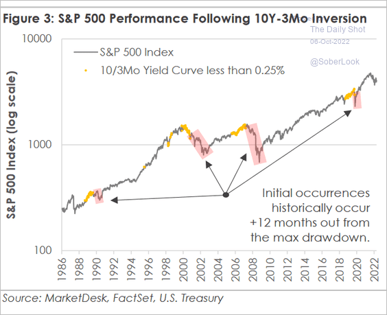 Quindi dobbiamo continuare a raccontare che siamo sul fondo. Lo stiamo raccontando da mesi e non dobbiamo cambiare opinione fino alla prova contraria. La prova contraria sarà data da indicatori macro che segnalano una recessione più profonda di quella che invece ora il mercato azionario sta scontando. Ho trovato un grafico di Goldman Sachs (che i lettori sanno io consideri affidabile non tanto per quello che scrive ma perché ha talmente tanti soldi che se anche sbaglia la previsione la raddrizza comprando e vendendo) che mostra come per il momento il mercato azionario stia scontando una recessione breve e mite (fondo dell’SP500 a 3600 e linea blu sul grafico) mentre se le cose buttano al peggio nel grafico che segue vedete come dalla linea blu si passa a quella grigia e finiamo a 3150 lasciando sul terreno un altro 12% circa.