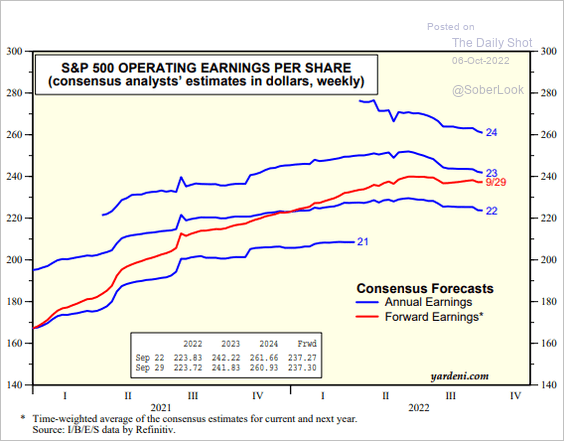 Gli analisti prevedono una crescita del 2.4% negli utili del terzo trimestre. Una piccola parte delle società dell’SP500 che hanno finora comunicato i loro risultati hanno segnalato nell’aggregato un rialzo di solo lo 0.4% rispetto ad un anno prima. Quindi in molti iniziano ad avere dei dubbi sul futuro dell’economia anche se nessun può dire finora che ci sia davvero recessione perché il mercato del lavoro è forte come un toro.
