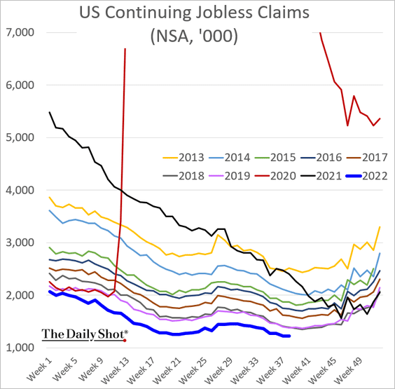 Venerdì il mercato del lavoro ha dimostrato di essere robusto nonostante le apparenze. E la linea blu qui sotto mostra come quest’anno i disoccupati continuino ad essere al minimo rispetto agli anni precedenti (notate la differenza con la linea rossa del 2020 che è fuori scala addirittura).