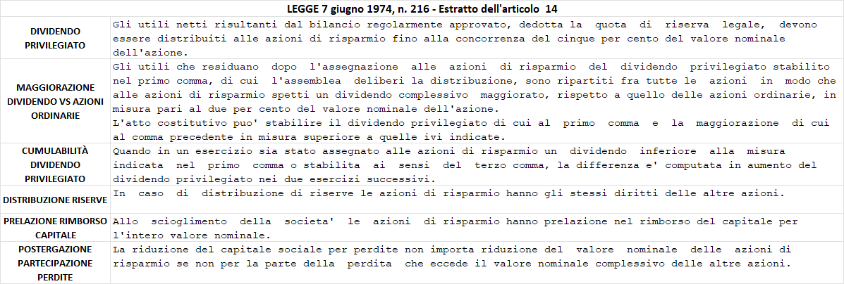 Nonostante questo, gli statuti societari si sono rifanno sostanzialmente alla “traccia” della legge istitutiva 216/1974, la quale attribuiva alle azioni di risparmio i seguenti privilegi patrimoniali: