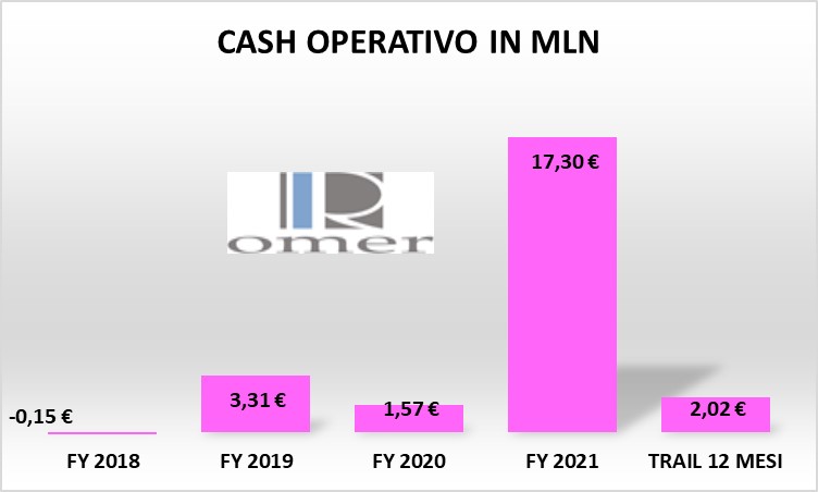 Considerando il dato TRAIL 12 mesi, OMER ha generato un cash flow operativo pari a € 2mln, ben al di sotto di quanto riportato nel 2021, anche se va tenuto conto che nell’esercizio precedente erano presenti fattori di carattere eccezionale.