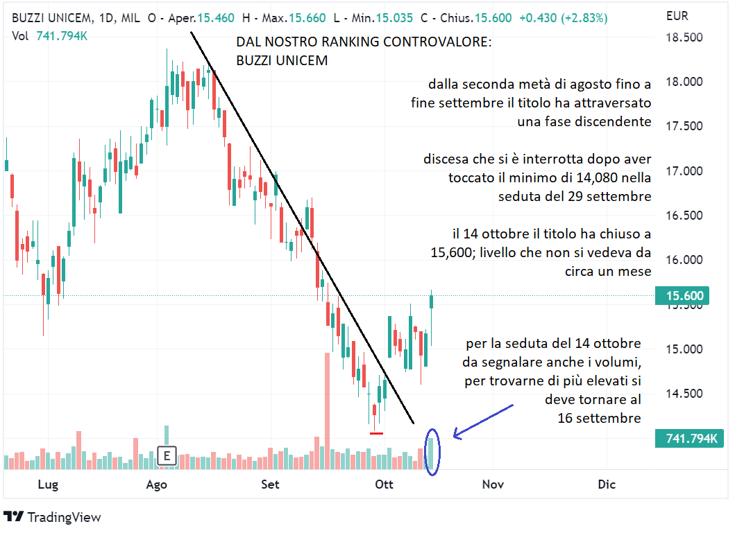 L'analisi grafica di quattro titoli selezionati dal nostro ranking controvalore: azioni Ferragamo, Moncler, Brembo, Buzzi Unicem.