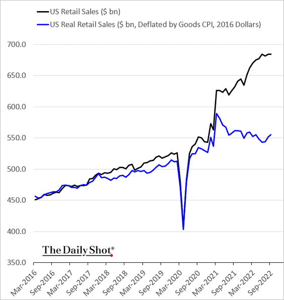 Il dato che ieri è stato il catalizzatore del rialzo è passato inosservato a gran parte degli analisti finanziari: le vendite al dettaglio nominali (linea nera) sono uscite piatte ieri mentre quelle “reali” (cioè al netto dell’inflazione nella linea blu) hanno continuato a crescere come dimostra il grafico che segue e questo nonostante i tassi di interesse al rialzo e un pessimismo generalizzato: