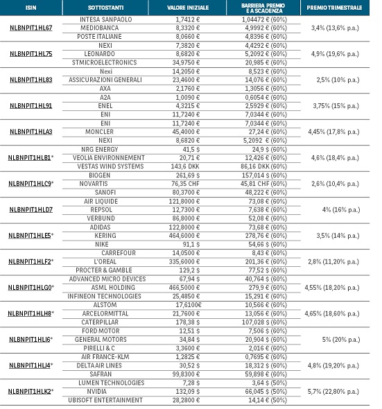 â— L’iniziativa riforestazione, novità da sottolineare â— Premi trimestrali assai elevati â— Alcuni con sottostanti molto solidi â— Effetto memoria â— Barriera coincidente in tutti i casi sia per la cedola sia per il rimborso â— Opzione Quanto (copertura) per sterilizzare il cambio di quelli con azioni in valute diverse dall’euro |