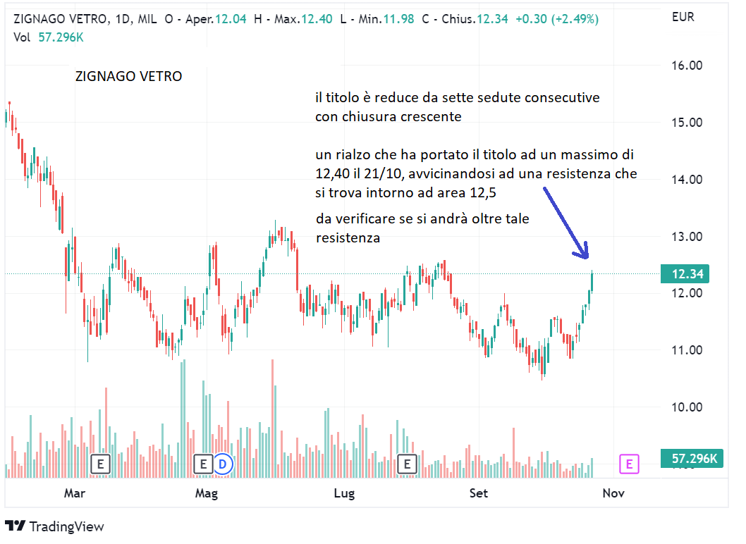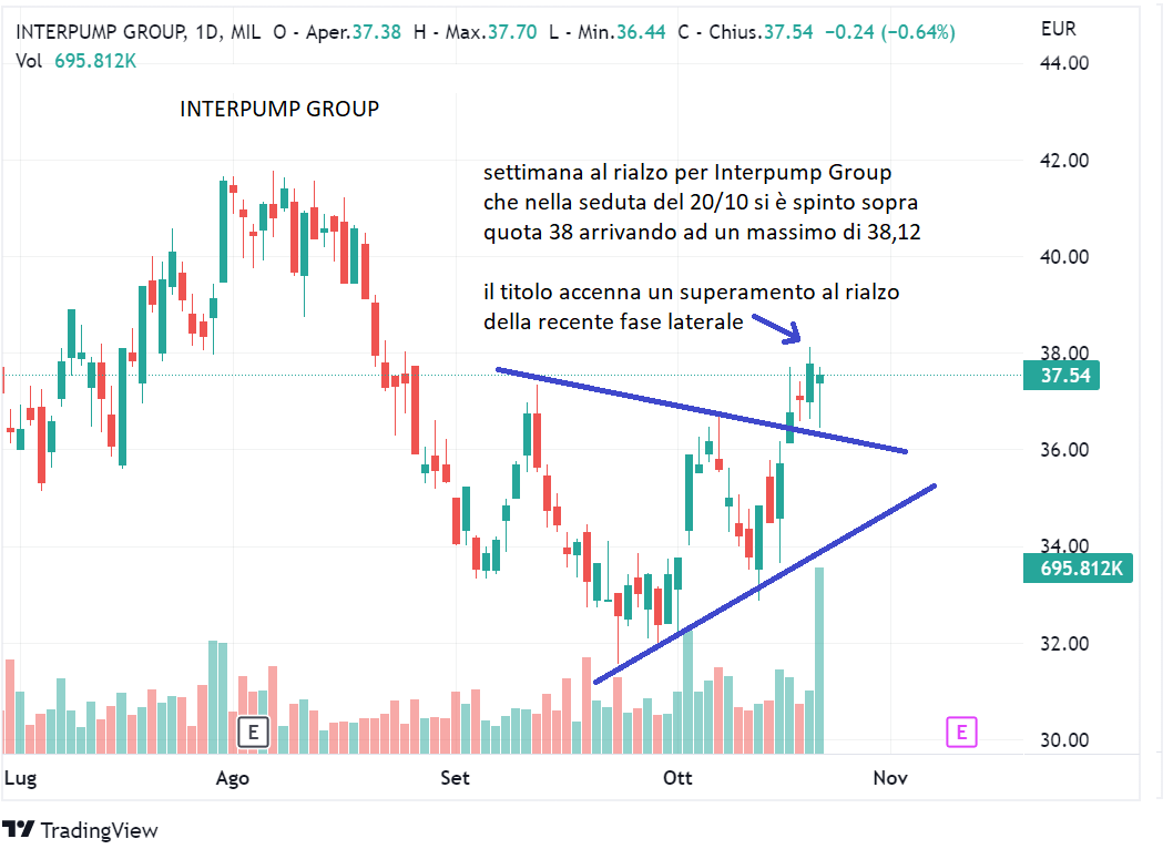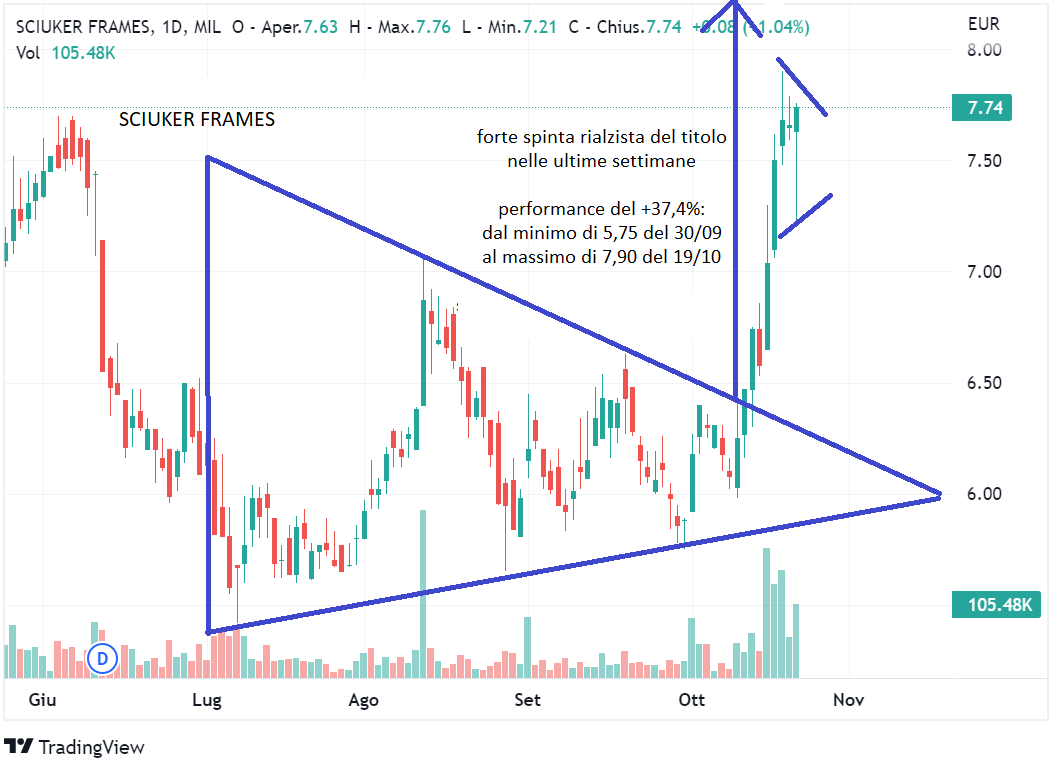 Di seguito 3 azioni interessanti italiane di cui una è Sciuker Frames che ha disegnato un triangolo simmetrico con obiettivo in alto rispetto alle quotazioni attuali. E l’abbiamo indicata nell’editoriale della settimana scorsa in tempi non sospetti.