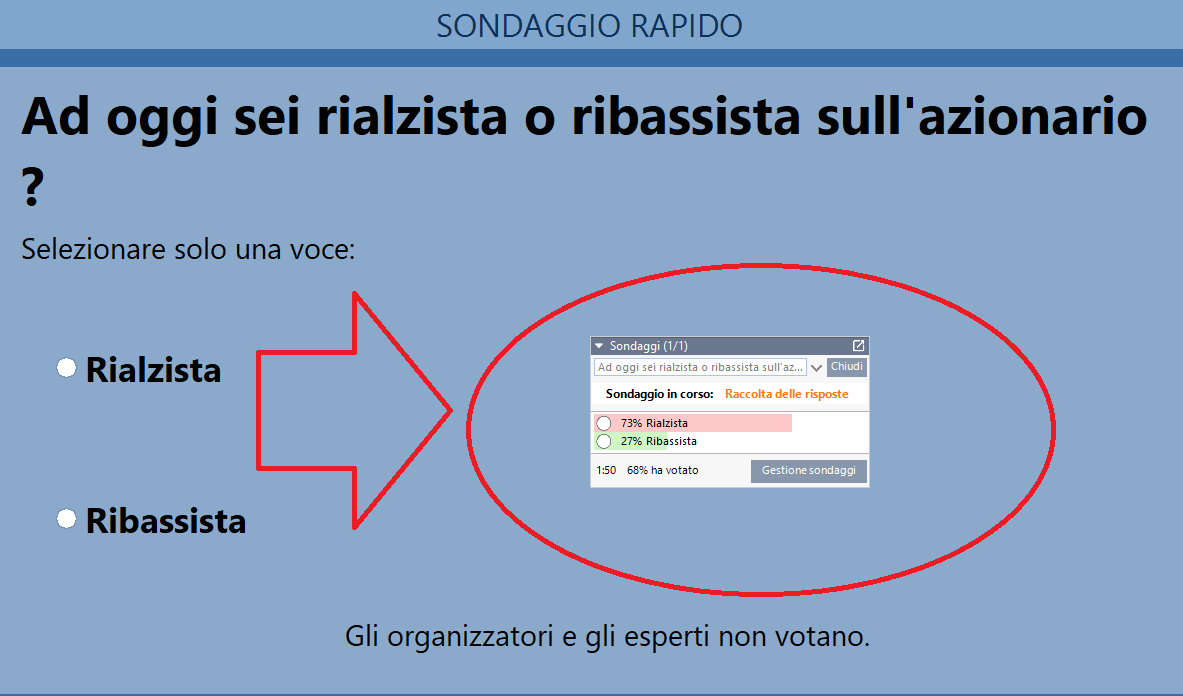 Interessante dato emerso oggi al webinar di Fabio Tanevini: un sondaggio condotto tra circa 200 partecipanti ha evidenziato come il 73% di essi fosse rialzista sull'azionario.