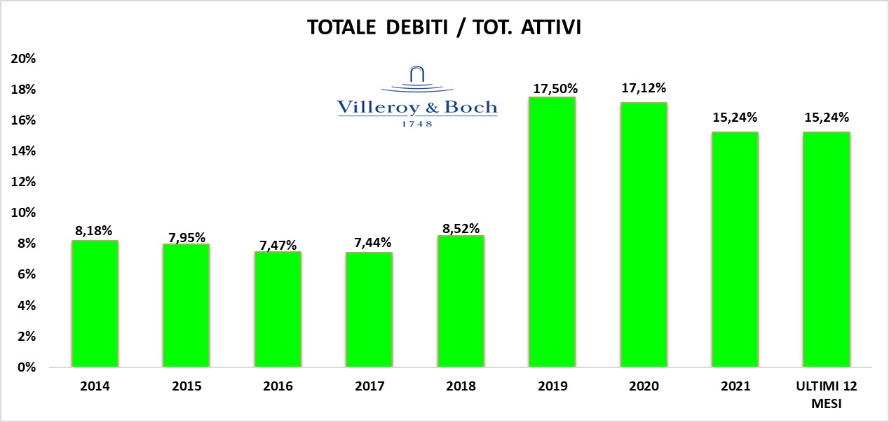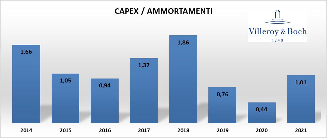 Approfondendo l’analisi degli investimenti in area Capex e rapportandoli con gli ammortamenti emerge che, VILLEROY & BOCH non ha assorbito eccessive risorse: il rapporto è pari a circa 1.