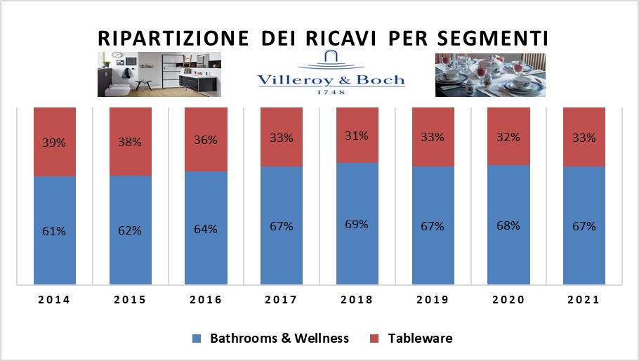 Analizzando la segmentazione dei ricavi, negli ultimi otto anni si nota un progressivo incremento del fatturato per l’area relativa ai prodotti di ceramica per il bagno.