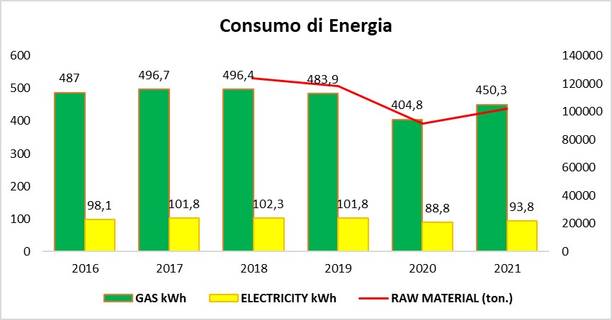 Prendendo spunto dall’ultimo bilancio di sostenibilità pubblicato dalla società emerge che, nel 2021, a fronte di un incremento dell’11% di materiale grezzo trattato (101.880 tonnellate vs 91.710), il consumo energetico è aumentato solo del 2,6%.