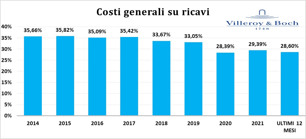 Dal grafico che segue è possibile apprezzare un aspetto che ha favorito il raggiungimento di questo virtuoso risultato: il management di VILLEROY & BOCH è riuscito nel corso degli ultimi anni ad abbattere progressivamente l’incidenza dei costi generali di struttura rispetto al fatturato.