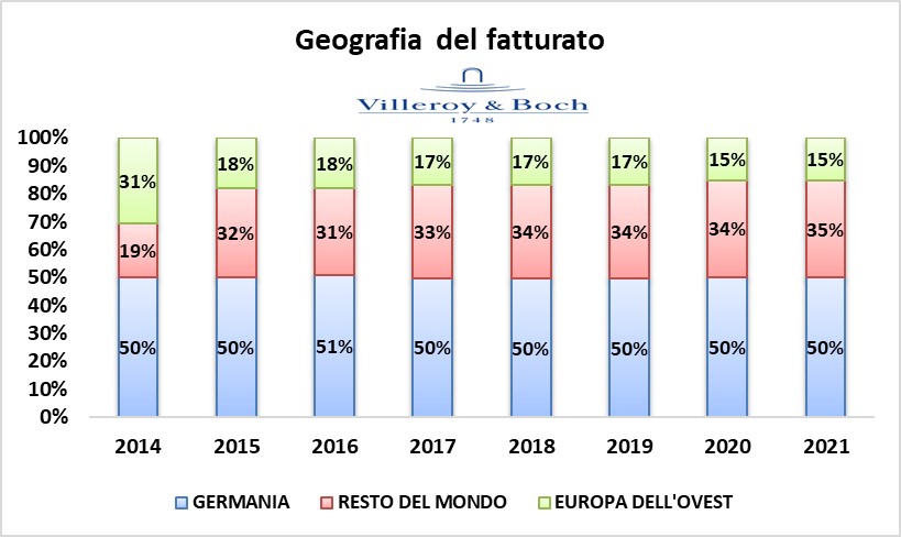 VILLEROY & BOCH realizza la maggioranza delle sue vendite in Europa (65%). La Germania rappresenta il mercato più vasto anche se è cresciuto in modo considerevole anche l’Export Extra europeo.