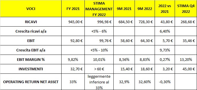 Nei primi nove mesi del 2022, i tassi di crescita di ricavi ed EBIT sono conformi a quanto comunicato dal management in occasione della pubblicazione dei dati relativi al 2021.