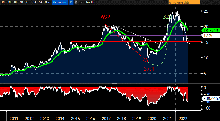 A febbraio 2022, il titolo ha raggiunto i massimi storici situati a quota € 25. Da li' è partita una rapida ondata ribassista che ha trascinato le quotazioni a fine settembre fino a quota € 13,6 (Drawdown -45,5%).