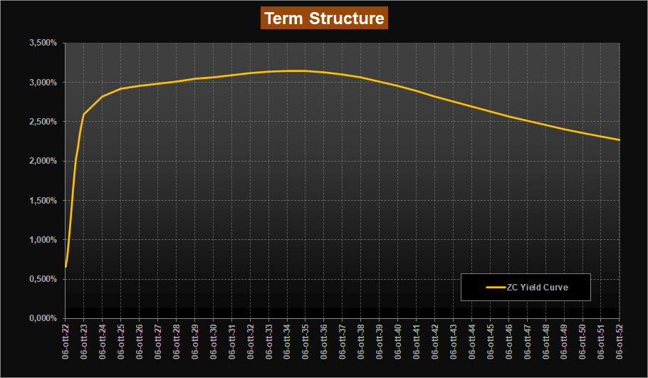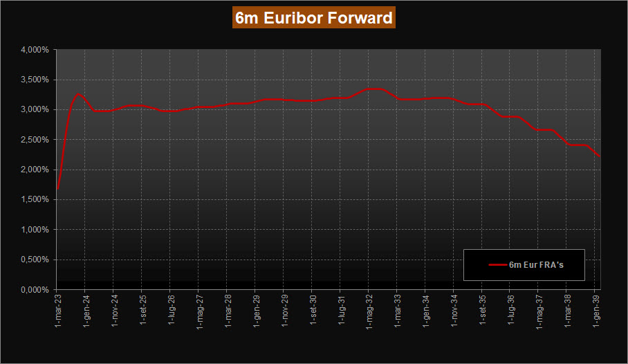 La lettura della ZC-Yield Curve mostra un ulteriore balzo dei rendimenti sul tratto a breve e medio della curva, mentre sul tratto a lunga l’aumento resta più contenuto, come già osservato nella scorsa analisi. Infatti, rispetto alla scorsa lettura il rendimento della scadenza a 10 anni cresce deciso portandosi ora in area 3,12% rispetto al 2,45% precedente, mentre la scadenza trentennale si porta ora in area 2,27% rispetto al 2,00% precedente. Shift verso l’alto quasi parallelo rispetto alla scorsa analisi per con la conformazione della curva, che sulla parte a breve mantiene l’accelerazione verticale dei rendimenti, e sulla parte a lunga accentua l’inclinazione negativa per le scadenze dal 2037 in poi. La curva evidenzia ora un massimo di rendimento sulle scadenze 2034-2035, in aumento rispetto alla scorsa analisi, passando attualmente in area 3,15% dal precedente 2,54% di rendimento. In aumento anche le previsioni dei tassi forward su Euribor 6 mesi, sia sul tratto a breve sia su quello a lunga. La curva rimane impennata sulla parte a breve e vede ora tassi oltre l’1,5% già per il 2023. Salgono anche i rendimenti sul tratto a lunga, ora sopra area 3,00% per le scadenze dal 2024 sino al 2035.