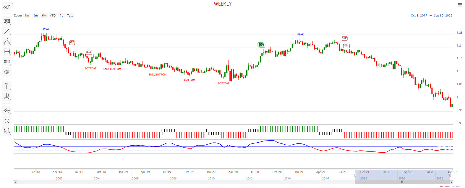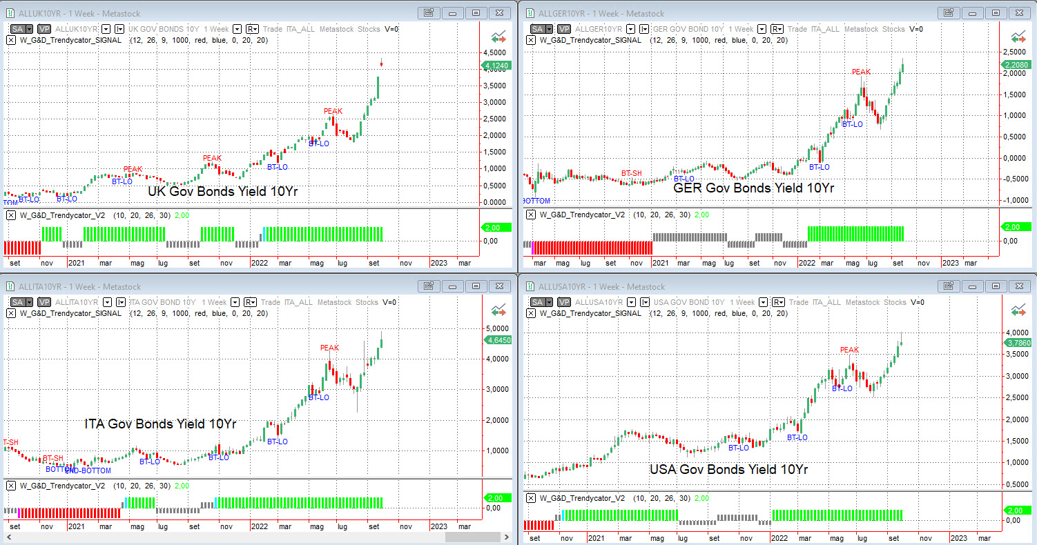 Osservando – a livello di analisi integrata – le curve dei rendimenti dei principali benchmark decennali, si nota l’esplosione dei rendimenti su tutte le aree valutarie. L’area UK vola e schizza e si porta ora sopra area 4,10% di rendimento per il GILT con Trendycator sempre in stato LONG. Decisa salita dei rendimenti anche sul BUND, che va in area 2,20% a livelli che non si vedevano dal 2013 e con Trendycator ancora in stato LONG. Inutile dirlo, schizzano al rialzo anche i rendimenti del nostro Btp decennale, con una punta addirittura verso area 5,00% e in aumento ora in area 4,60% rispetto ad area 3,55% del mese scorso con Trendycator sempre LONG. Infine, l’area USA con i rendimenti del Treasury decennale che riprendono la marcia al rialzo, ora ben saldi in area 3,80% dopo aver toccato un massimo al 4%,00 ancorati nei pressi di area 3,00% e con Trendycator sempre LONG.