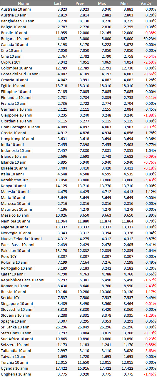 Consueta sezione dell’analisi sui mercati obbligazionari, con l’introduzione sotto forma di ranking dei bond governativi mondiali con qualunque rating. In alcuni casi, per alcuni emittenti o per alcune valute, il rapporto rischio/rendimento di questi bond può essere anche piuttosto speculativo. Il ranking considera i bond benchmark decennali in tutte le valute di emissione.