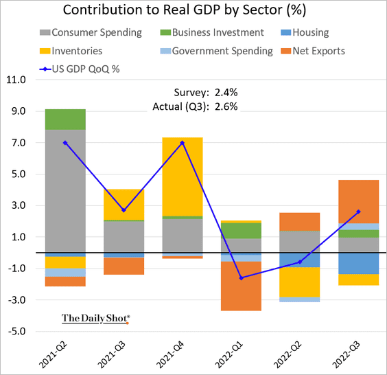 Di seguito il PIL americano con i suoi componenti: possiamo vedere come le esportazioni abbiamo salvato la partita (arancione). La linea blu indica l’andamento percentuale del GDP che ha fatto quello che abbiamo scritto sopra: ha uncinato. Se era recessione è stata molto corta e manco l’abbiamo vista.