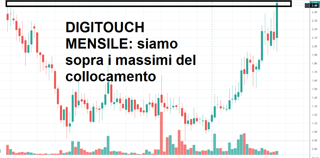 Veniamo ora all’Italia dove con le dovute giuste proporzioni abbiamo un qualcosa che non era mai successo finora negli ultimi mesi: una azione sta rompendo i massimi storici. Si tratta di Digitouch che ha rotto i massimi del collocamento.