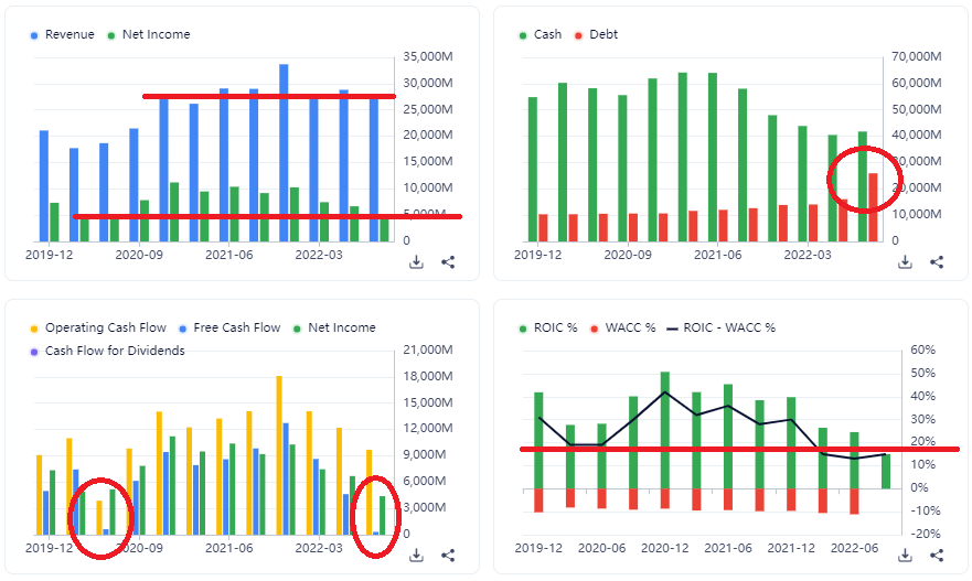 Se consideriamo i dati trimestrali nella immagine che segue vediamo come il fatturato di Meta è sì diminuito ma niente che non sia successo in passato e lo stesso per la redditività.