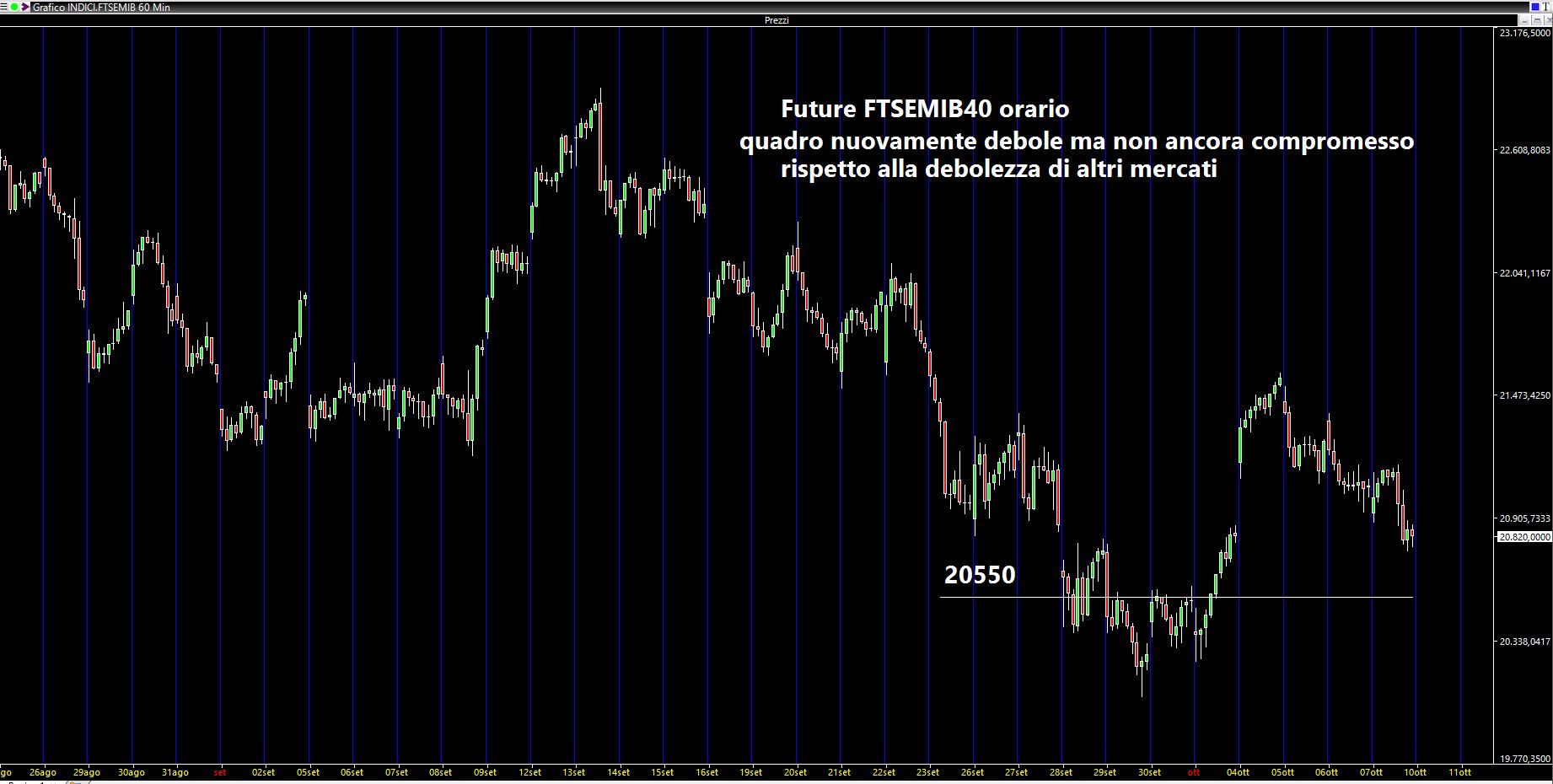 Osservando un timeframe più ristretto a 60 minuti presterei attenzione all'area posta a 20550 punti circa di derivato, anche se credo che molto dipenderà dal comportamento dei mercati americani che vedremo in seguito.