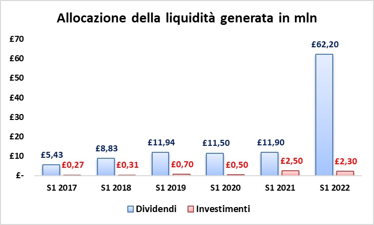 Il business di FEVER TREE non richiede eccessive risorse in CAPEX: l’elevato stock di liquidità detenuto a fine 2021 (£ 166,2 mln) è stato impiegato prevalentemente in dividendi (£ 62,2 mln di cui £ 50 mln come “dividendo speciale”) ed investimenti (£ 2,3 mln).