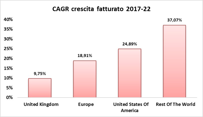 Approfondendo le dinamiche di sviluppo dei ricavi si nota che l’espansione estera ha riportato eccezionali tassi di sviluppo. Gli Stati Uniti, in pochi anni, sono passati da essere un mercato residuale a uno snodo fondamentale (CAGR: 24,89%).