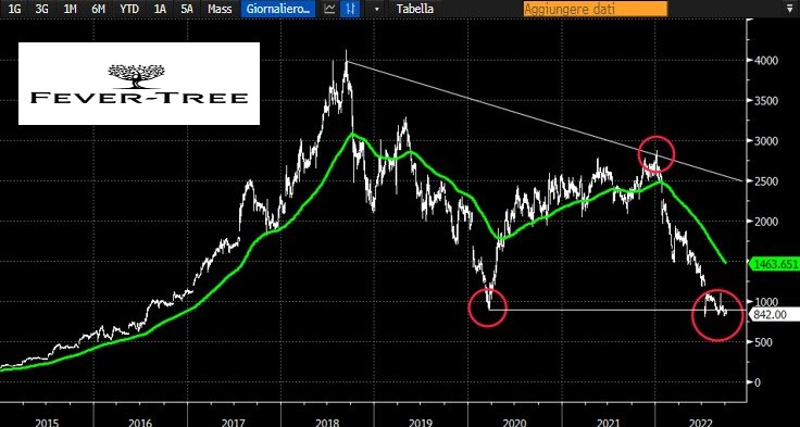 Dopo un buon andamento mantenuto fino ad inizio 2022, le quotazioni di FEVER TREE sono rapidamente crollate raggiungendo gli attuali livelli che sono collocati in prossimità di quelli registrati nella fase più acuta del Covid-19 crash.