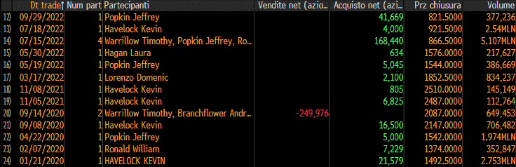 A partire da maggio 2022, a seguito del crollo delle quotazioni, si assiste ad un’intensa attività di acquisti da parte degli insider. Nel grafico qui sotto riportato, sono evidenziate in verde gli eventi di “Insider trading”.