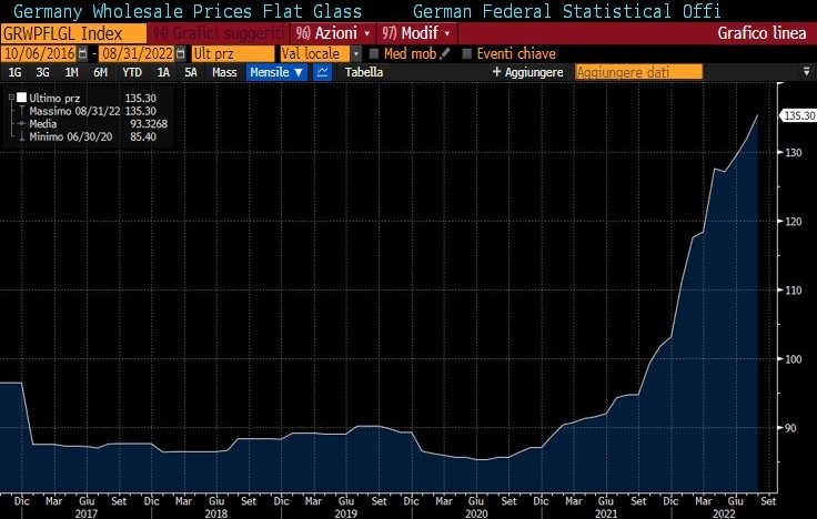L’andamento esplosivo del prezzo del gas ha causato un aumento considerevole dei prezzi del vetro: il grafico qui sotto fa comprendere l’entità del problema.