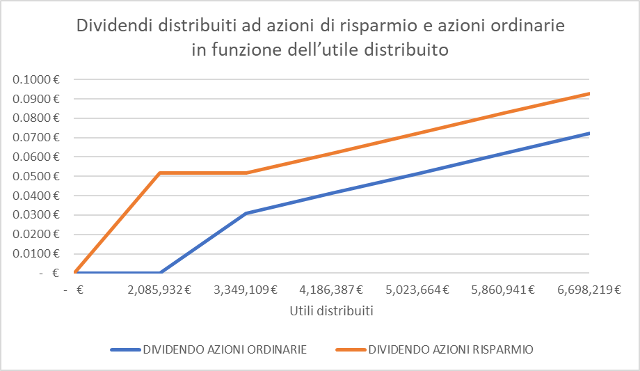 Gli utili degli ultimi 16 anni si sono mantenuti stabilmente e in misura consistente al di sopra della soglia di € 3.3 mln, per cui la differenza tra i due dividendi è sempre coincisa con la maggiorazione spettante alle azioni di risparmio rispetto alle azioni ordinarie (situazione B).