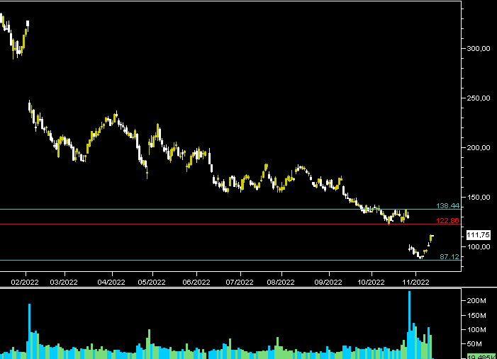 Il gap lasciato ai 122 dollari circa, a nostro modo di vedere, sarà chiuso con prospettiva 138 dollari al superamento, tenendo presente sempre che la soglia degli 87 dollari deve essere usata come stop loss in quanto il naturale target di downtrend è situato circa sui 60 dollari, e questo perchè una rondine non fa primavera.