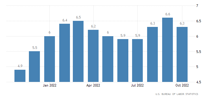 La vera sorpresa però è arrivata dall’indice dei prezzi al consumo core (che esclude il settore del cibo e dell’energia), che a livello annualizzato il dato core passa dal +6,6% di settembre al +6,3% di ottobre, al di sotto del consensus fissato a +6,5%. Mentre a livello mensile segna un +0,3%, contro un consensus del +0,5% ed un dato di settembre del +0,6%. I dati sono rilasciati dall’U.S. Bureau of Labor Statistics.