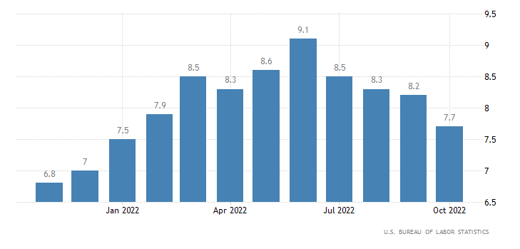 Il dato dell’indice dei prezzi al consumo a livello annualizzato ad ottobre ha visto il temuto contributo dell'energy, ma un rallentamento del food, scendendo al 7.7%, livello visto l’ultima volta all’inizio dell’anno e ben al di sotto dell’8,2% di settembre e contro attese di 8,0%. Il dato mensile ha mostrato una stabilizzazione sullo 0,4%. Il dato è rilasciato dall'U.S. Bureau of Labor Statistics.