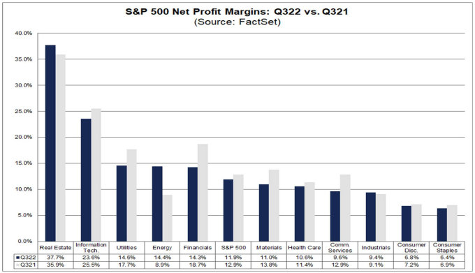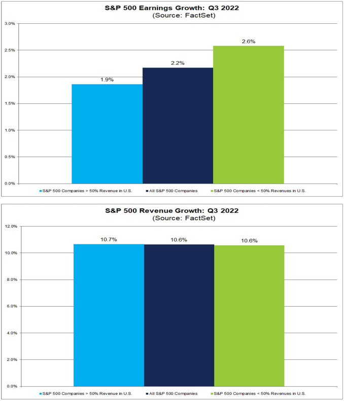 Crescita degli utili e dei ricavi: nel terzo trimestre 2022, il tasso di crescita degli utili per le società dell'S&P500 è del 2,2%, situazione che ad oggi segna il tasso di crescita degli utili più basso registrato dall'indice dal terzo trimestre 2020 (-5,7%). In termini di ricavi, il 71% delle società S&P 500 ha riportato ricavi effettivi superiori alle stime con un tasso di crescita, ad oggi, pari al 10,6%.