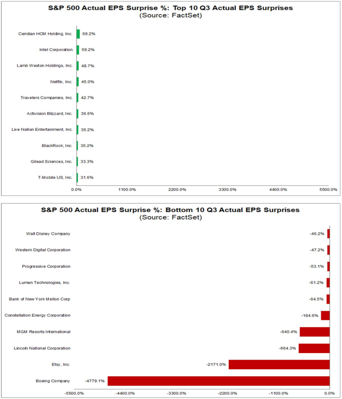 Di seguito il grafico con le 10 società che hanno riportato le migliori differenze percentuali tra gli utili effettivi rispetto alle stime degli analisti e le 10 società che hanno riportato le peggiori differenze percentuali tra gli utili effettivi rispetto alle stime degli analisti.