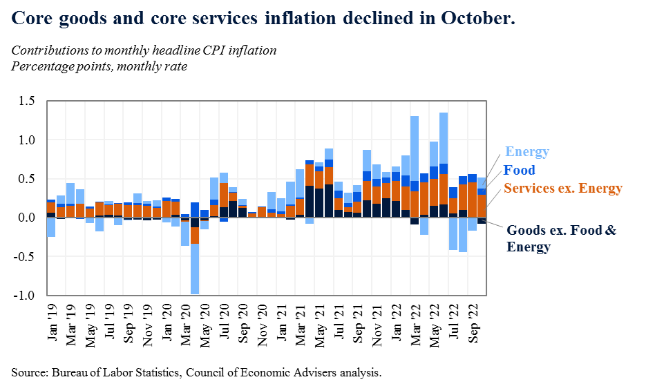 Una performance pazzesca, a fronte di un dato CPI che, sì, è uscito significativamente sotto attese, interrompendo la striscia di sorprese al rialzo degli ultimi 12 mesi, ma che non può essere considerato un totale cambio di scenario, in quanto i segnali erano già latenti nei dati precedenti, così come riportato varie volte su queste colonne, con l'inflazione “core” dei beni era già nulla a settembre, con i prezzi delle auto usate che scendevano e soprattutto con la temuta componente shelter (alloggi) i cui segnali dipingevano già un rallentamento in atto e presagivano ulteriori disastrosi, tanto da parlare di recessione sul mercato immobiliare (v. grafico settoriale CPI “core”):