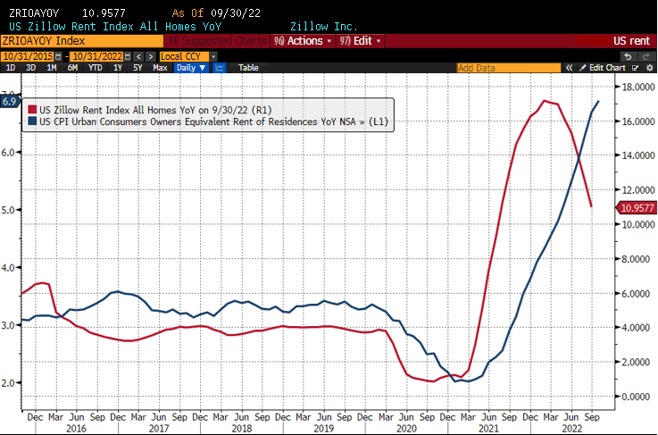 Ma è sulla componente alloggi che si innesta tutto il discorso fatto più e più volte negli ultimi mesi. La rilevazione di OER e Rents del CPI è in ritardo. In realtà le dinamiche di mercato stanno cambiando molto rapidamente, e questi indicatori lo mostrano bene (v. grafico indice Zillow rent all homes contro CPI Owners equivalent rent che chiamava da tempo questo rallentamento):