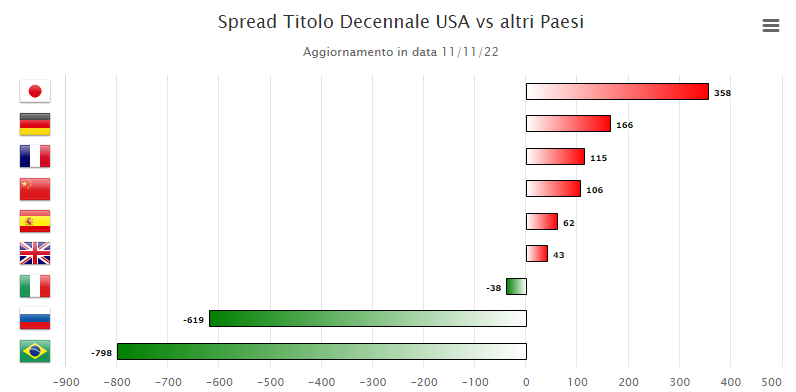 Infine riportiamo lo spread del Treasury decennale USA rispetto all'omologo titolo dei principali paesi mondiali ad oggi 07 novembre.