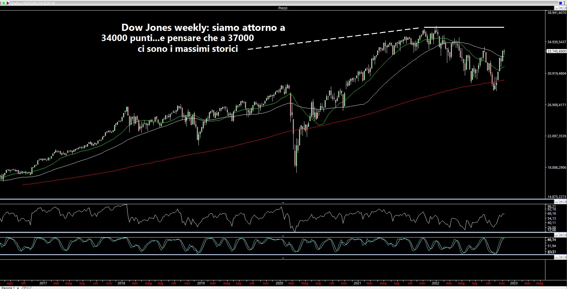 Da inizio ottobre ad oggi abbiamo assistito ad un rally incredibile su quasi tutti i mercati, Dow Jones in primis: da 28800 è riuscito a spingersi a 34000 punti: +18%. Folgorante. Ancor più incredibile è il fatto che ci siano i massimi storici poco sopra ed attorno a 37000 punti come potete vedere sul grafico weekly. Certamente siamo a stretto contatto con resistenze statiche molto forti: quelle di metà agosto da cui è poi scaturito il ribasso di settembre.