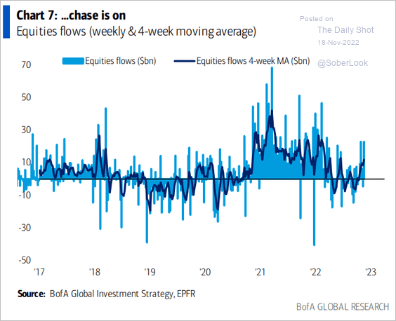 E purtroppo succede sempre la stessa cosa: quando si è in odore di recessione e vi assicuro che basta la paura della recessione ecco che gli equities flows ovvero i flussi di soldi verso gli investimenti azionari si mettono in moto: del resto i bravi investitori non comprano quando il sangue scorre alto nelle strade (Bernard Baruch) ?