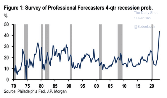 Nel grafico che segue le previsioni della maggior parte degli analisti che prevedono ormai con percentuali del 50% una recessione nel quarto trimestre del 2022 che si porterà ovviamente anche sul 2023: