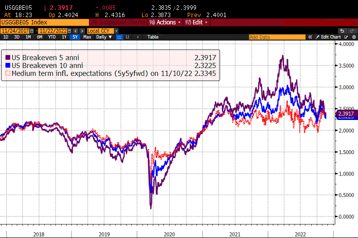Ovviamente nessun "disancoraggio delle aspettative". Questo sicuramente è un ulteriore fattore di inversione, visto che i Fed Funds sono già al 4% e la maggioranza dei membri FED li vede attorno al 5%, mentre la crescita è in indebolimento e le aspettative di inflazione sono contenute, situazione che potrebbe indurre la FED ad anticipare la pausa dei rialzi ed eventualmente invertire la rotta. Questa conclusione implicherebbe due scenari, dei quali il primo, un avvitamento dell'economia ed il secondo un calo delle aspettative di inflazione sotto il 2%. Il primo caso, ovviamente, non potrebbe essere di buon auspicio per i mercati azionari; mentre il secondo potrebbe essere di sollievo solo se non dovesse essere causato da un crash dei dati macroeconomici. E qui viene il bello, in quanto è impensabile o quanto meno molto difficile, immaginare un materiale calo delle aspettative di inflazione disgiunto da un deterioramento macro, dal momento che l'inflazione USA nel 2022 è principalmente gonfiata dalla domanda. Pertanto possiamo concludere che il sollievo sarà temporaneo ma sicuramente più temperato rispetto alla prima ipotesi. Come detto in precedenza se i breakeven inflation dovessero rompere stabilmente al ribasso il 2% la retorica aggressiva della FED scomparirà, in caso contrario economia e mercato continueranno a fare i conti con una FED più o meno ostile.