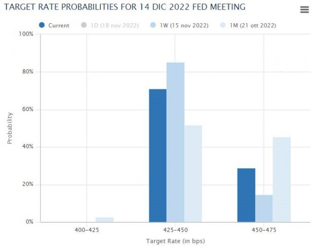 Nonostante i dati flash sulle PMI pubblicati da S&PGlobal hanno rivelato che l'attività commerciale nel settore privato ha continuato a contrarsi a un ritmo accelerato a novembre; nonostante i verbali dell'ultima riunione politica della Federal Reserve hanno mostrato che la maggior parte dei membri ha sostenuto di rallentare il ritmo degli aumenti dei tassi in modo da avere più tempo per valutare gli effetti ritardati delle azioni politiche sull'economia, facendo scendere il rendimento dei titoli del Tesoro USA a 10 anni al livello più basso dall'inizio di ottobre al 3,65% e stessa sorte per il Dollar Index; nonostante la CINA abbia registrato un massimo giornaliero record di 32.695 casi di coronavirus; nonostante il mercato delle criptovalute sia stato colpito da casi di bancarotta di alto profilo, con il crollo dell'exchange FTX come ultimo esempio e che sta avendo un effetto a catena, con altre società associate che fissano un possibile fallimento come la piattaforma di prestito di criptovalute Celsius Network che ha presentato istanza di fallimento dopo aver interrotto i prelievi degli utenti;