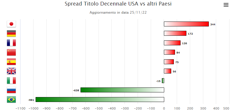 Infine riportiamo lo spread del Treasury decennale USA rispetto all'omologo titolo dei principali paesi mondiali a venerdì 25 novembre.