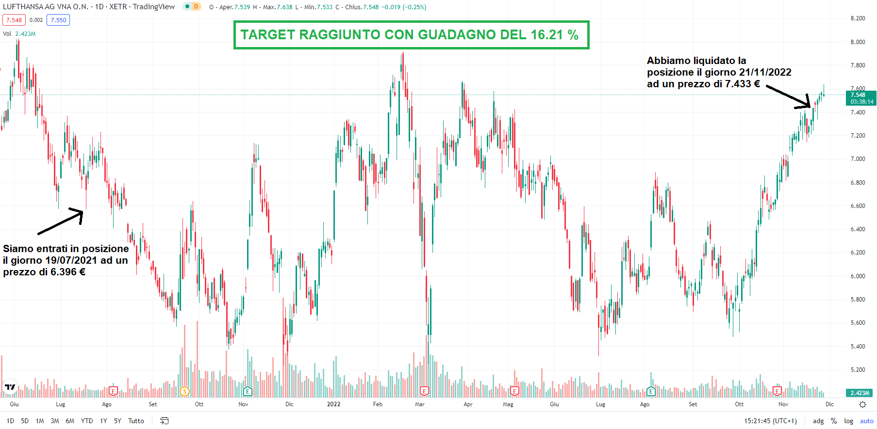 Come potete vedere dal grafico abbiamo acquistato il titolo lo scorso anno, più precisamente il 19 luglio del 2021 ad un prezzo di 6.396 € ed abbiamo liquidato la posizione pochi giorni fa: il 21 novembre 2022 ad un prezzo di 7.433 €, raggiungendo il target prefissato e "volando" ad un guadagno del +16.21 %.