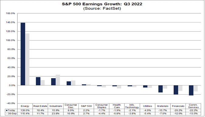 Alla fine delle settimane di punta della stagione degli utili del terzo trimestre, il numero di società dell'S&P500 che hanno riportato una sorpresa positiva sugli utili e l'entità di queste sorprese sugli utili sono ancora al di sotto delle loro medie a 5 e 10 anni. Complessivamente, l'85% delle società dell'S&P 500 ha riportato risultati effettivi per il terzo trimestre del 2022 fino ad oggi. Di queste società, il 70% ha riportato un EPS effettivo al di sopra delle stime, che è inferiore alla media quinquennale del 77% e inferiore alla media decennale del 73%.