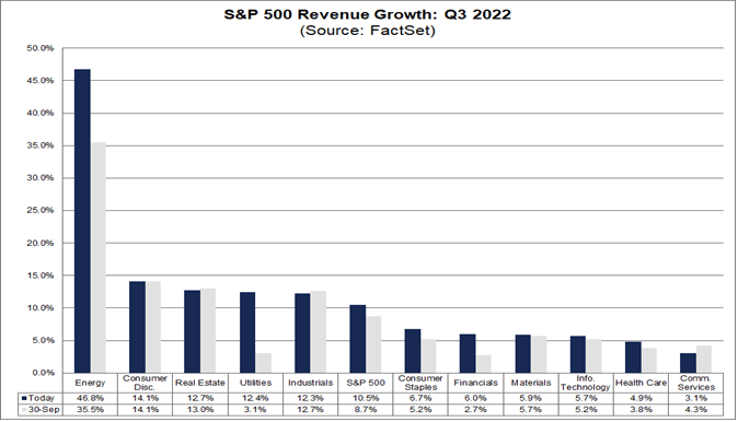 Mentre in termini di ricavi, il 71% delle società S&P500 ha riportato ricavi effettivi superiori alle stime, che sono al di sopra della media a 5 anni del 69% e al di sopra della media a 10 anni del 62%. Complessivamente, le aziende registrano ricavi superiori del 2,5% rispetto alle stime e sono al di sopra della media quinquennale dell'1,9% e della media decennale dell'1,2%. Le sorprese positive sui ricavi segnalate da società in più settori (guidate dai settori dell'energia e della finanza) sono state i maggiori contributori all'aumento del tasso di crescita dei ricavi complessivi dal 30 settembre. Tutti gli undici settori registrano una crescita anno su anno dei ricavi, guidata dal settore energetico.