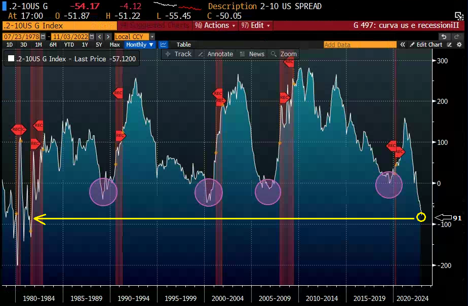 Dando ora uno sguardo agli investimenti di carattere monetario, i rendimenti sono tornati a salire chiudendo la settimana con il 10 anni sopra il 4% superando in intraday il 4,2% ed il 2 anni sopra il 4.6% superando in intraday il 5% creando un nuovo massimo di negatività dello spread 2 - 10 anni, giunto sopra gli 80 bps a indicare l'incombere di una recessione. E' il nuovo record dagli anni 80 a quanto sembra dal grafico. Visto l’atteggiamento della FED, non si escludono nuovi significativi record.